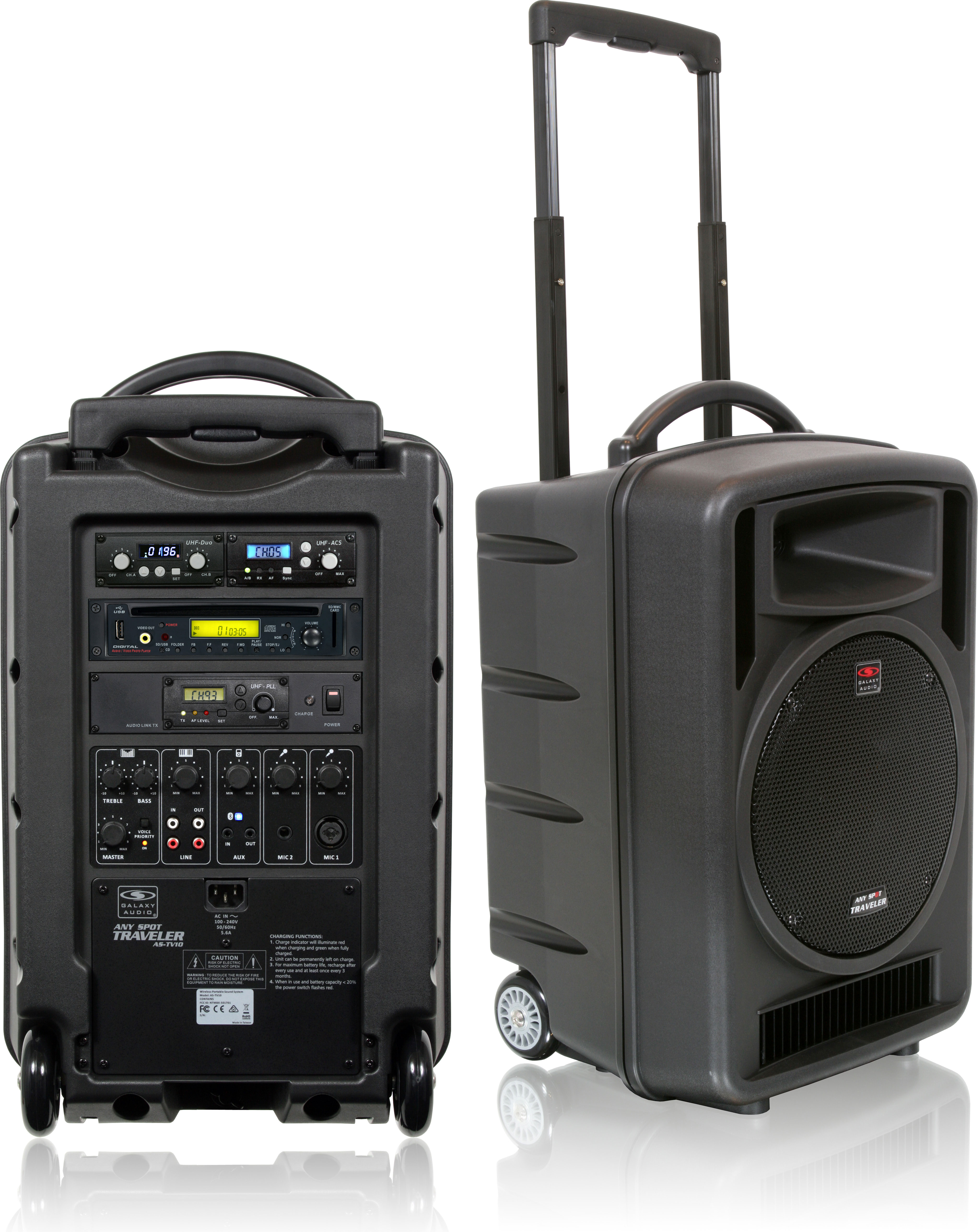 The equipment can include 1-4 speakers, bluetooth connections, wireless handheld mics, wired handheld mics, wireless lavalier mics, cd/dvd/mp3 inputs, and much more.